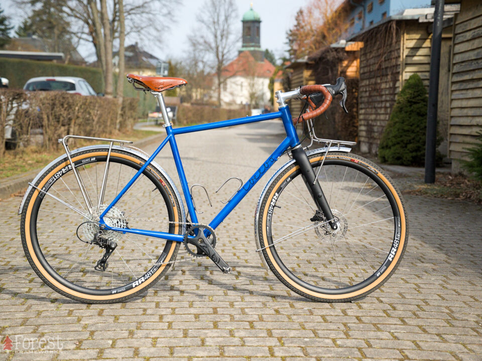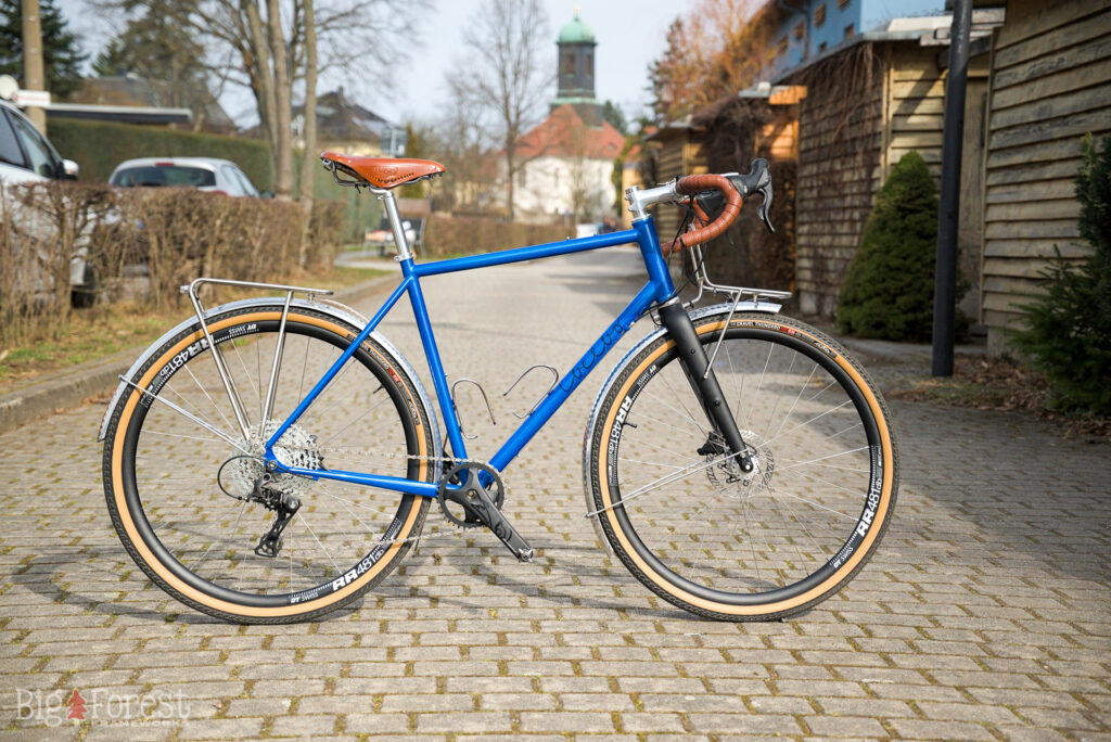 Die Rahmengeo wurde konsequent auf die im Gabelbaukurs gebaute Starrgabel ausgelegt, die integrierte Sattelstütze (ISP) war ein langgehegter Wunsch. Um den „cleanen Look“ zu erreichen wurden die Leitungen großteils innengeführt und unauffällig befestigt. Das Rahmenschloss und das Tretlagergehäuse machen Singlespeed mit Gates-Riemen und EBB optional möglich. Ein Highlight ist die erste Custom-Steel-Kurbel von Stainlesssteelworks mit idealer Kettenline für den 1×11 Antrieb. Als Bremsen kommen klassische Hope Mono Mini IS zum Einsatz, dazu eine Vorbau-/Lenker-Kombi von Nitto und ein Brooks C17 carved.